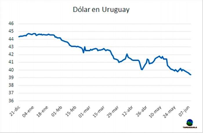 El dólar mantiene impertérrito su desvalorización en la plaza local. Ayer perdió otros 10 centésimos para cerrar a Ur$/US$ 39,376, con un descenso de 12% en lo que va del año y de 10% anual. Si se tiene en cuenta que la inflación fue de 9,4% en los últimos 12 meses, la pérdida de poder de compra del dólar se acerca a 20% en un año. En las semanas anteriores el peso uruguayo seguía bastante de cerca la evolución del real. La moneda uruguaya se valorizaba en niveles cercanos a lo que lo hacía la brasileña. Sin embargo, últimamente el real está en caída, en tanto que el peso uruguayo sigue ganando valor, complicando la ecuación del sector agroexportador. En la última semana, a la vez que el peso uruguayo se valorizó 1,6% frente al dólar, el real brasileño se devaluó 2,4%. (Tardáguila Agromercados)